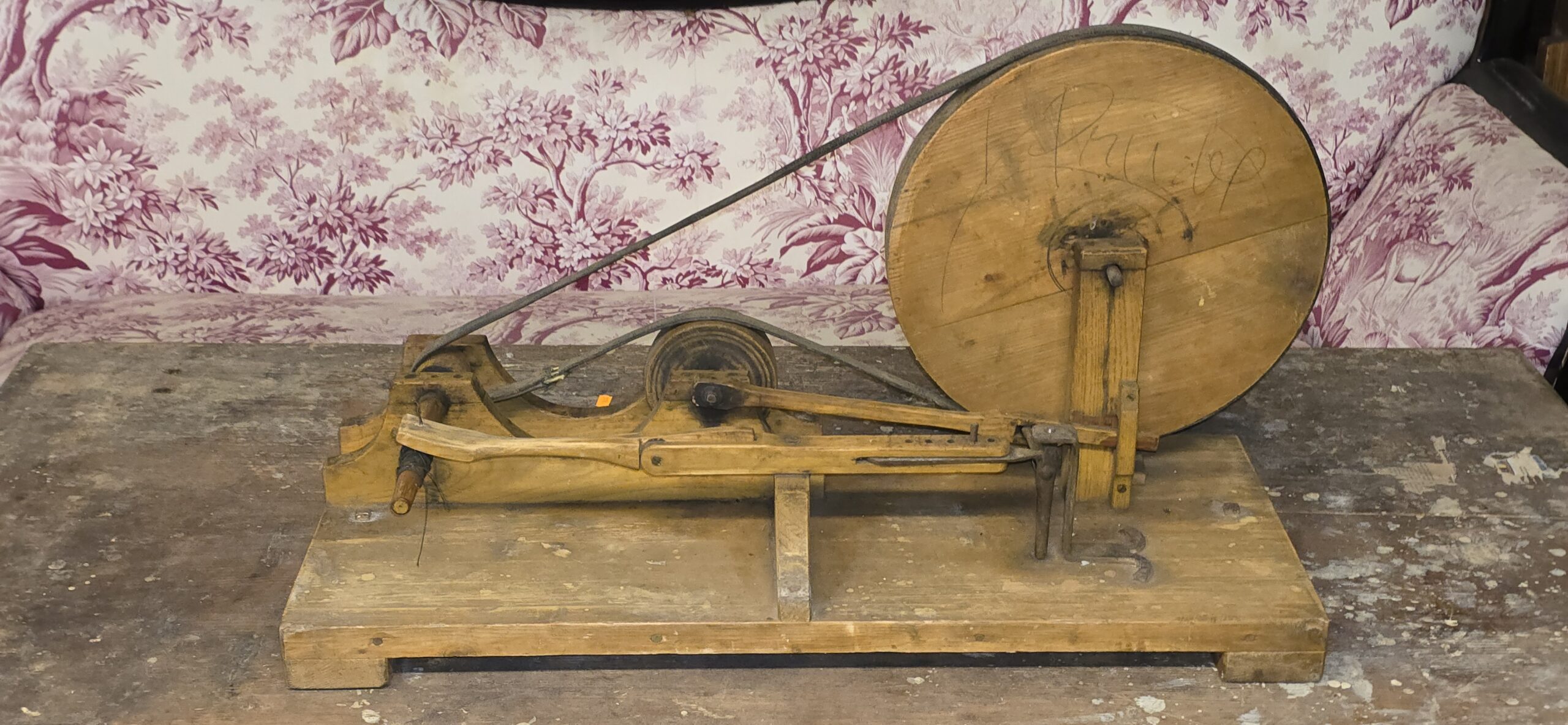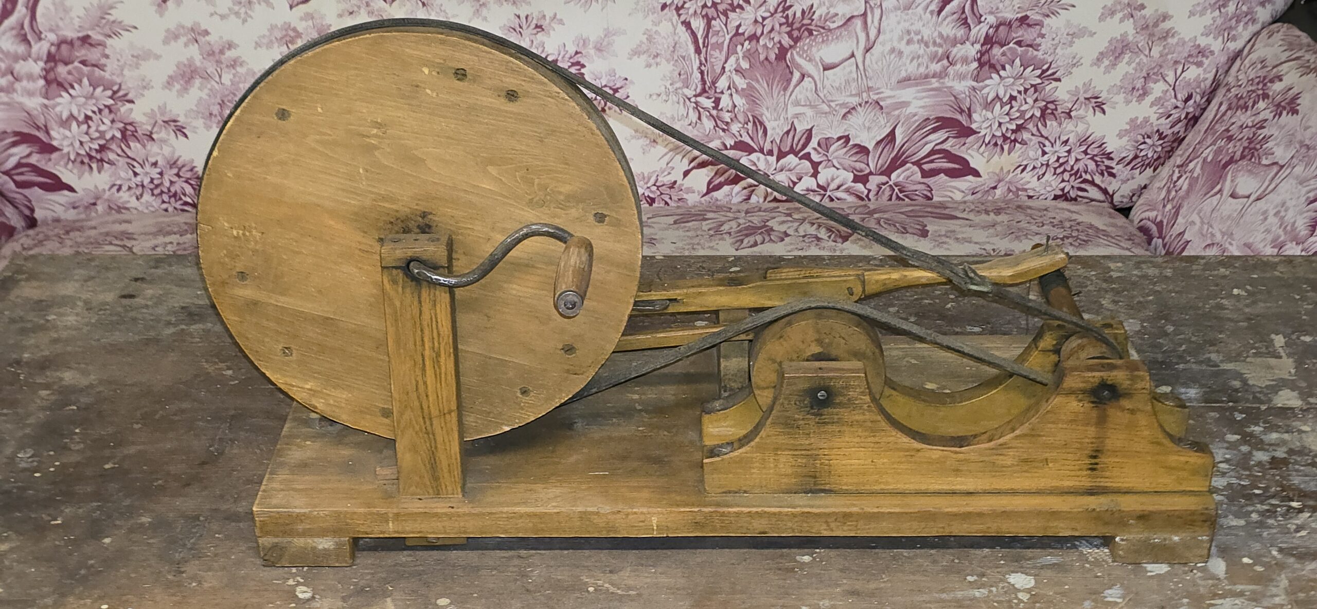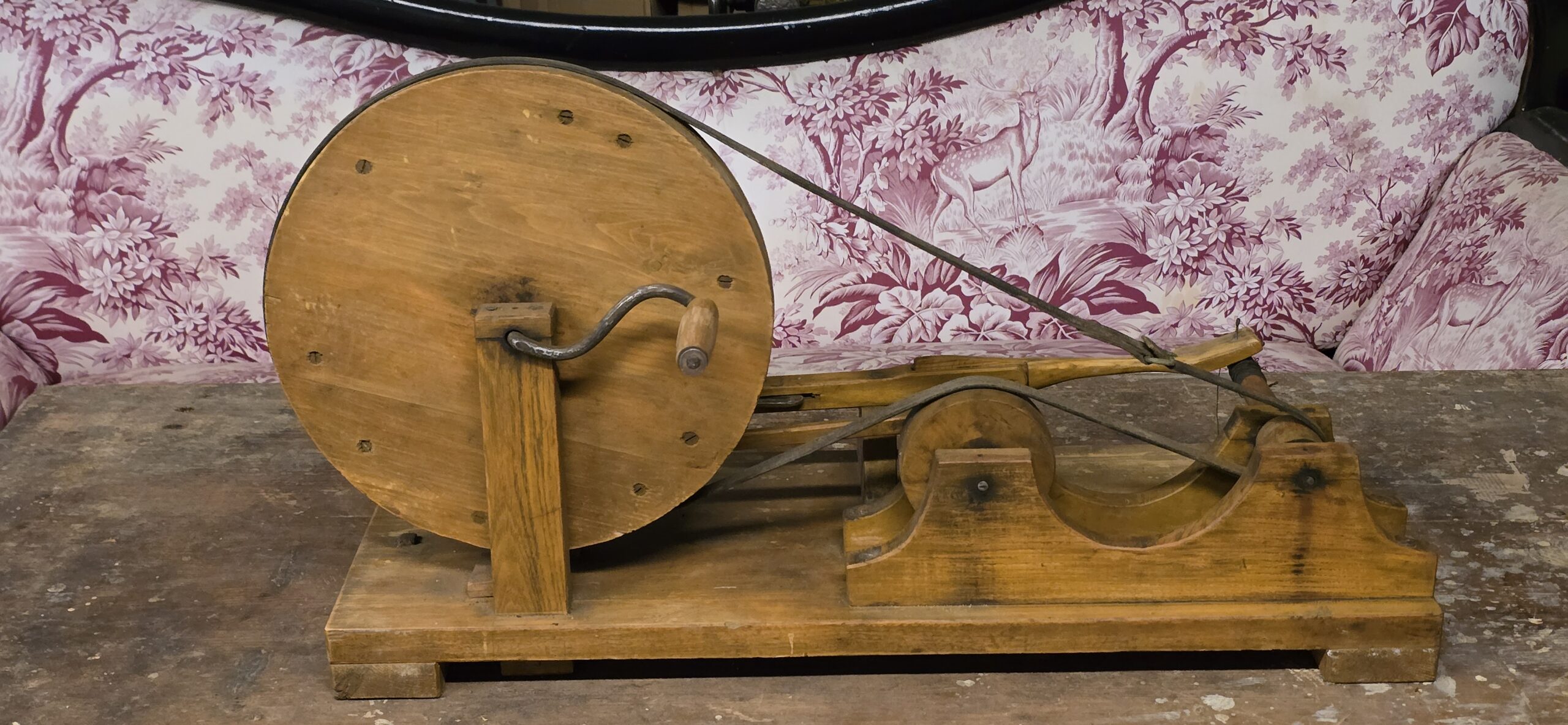 Huvitav ja antiigiturul sellisel kujul väga harva liikuv tööriist/masin. Mõeldud niidi ja mu peenema materjali kerimiseks, poolidele. Väga heas korras, puhas.Põnev kaadervärk.Laius – 76 cm. Sügavus 53 cm.XIX saj. lõpust.